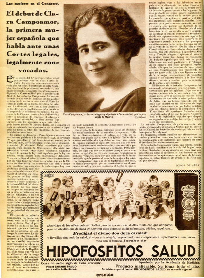 “Considero que es mi convicción la que habla; que ante un ideal lo defendería hasta la muerte; que pondría, como dije ayer, la cabeza y el corazón en el platillo de la balanza, de igual modo Breno colocó su espada, para que se inclinara en favor del voto de la mujer, y que además sigo pensando, y no por vanidad, sino por íntima convicción, que nadie como yo sirve en estos momentos a la República española.” Clara Campoamor discurso en las Cortes el 1 de octubre del 1931.