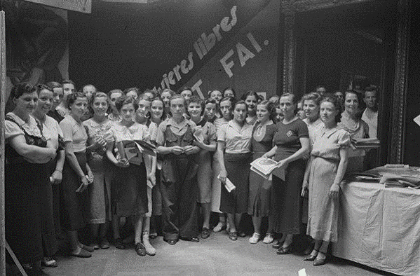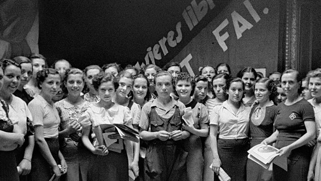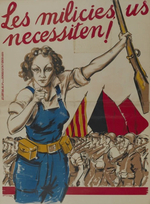 Cartel de 1936, las banderas anarquistas acompañan a la senyera, el sindicato CNT fue el primero en aceptar a las mujeres como milicianas. Durante los primeros meses de guerra las mujeres fueron voluntarias en las milicias organizadas por los partidos políticos y sindicatos.